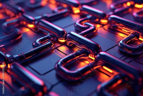 Metallic chain links illuminated by vibrant orange glow on a textured surface create a futuristic ambiance in a digital environment