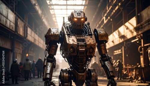 robot, futuristic, machine, technology, android, automation, artificial, intelligence, rust-eaten, metal, factory, warehouse, industry, complex, mechanic, cable, android, glowing, eye, surveillance, watchful, guarding, protection, weathered, surface, metallic, structure, out-of-date, gritty, interior, building, industrial, area, processing, men at work, shadow, illuminated, decay, standing