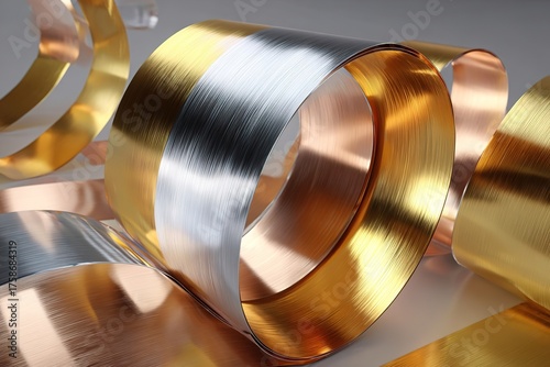 Metallic ribbons crafted from silver, gold, and copper display a striking arrangement suitable for artistic projects or decor