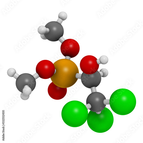 Metrifonate (trichlorfon) insecticide molecule, 3D rendering.