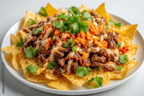 mexican-korean fusion bbq beef nachos topped with cilantro, gochujang sauce and kimchi