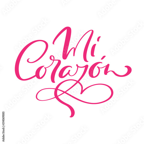 Mi Corazon vector hand drawn calligraphic text. Translation from Spanish My Heart. Calligraphy romantic inscription with heart for valentine card