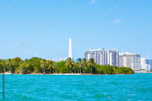Miami, Florida, USA downtown skyline. Building, ocean beach and blue sky. Beautiful city of United States of America