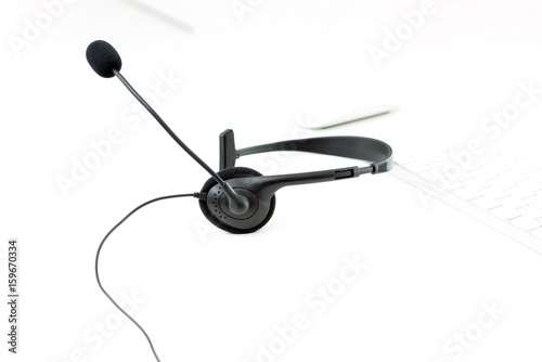 Microphone headset on white table with blur computer keyboard background