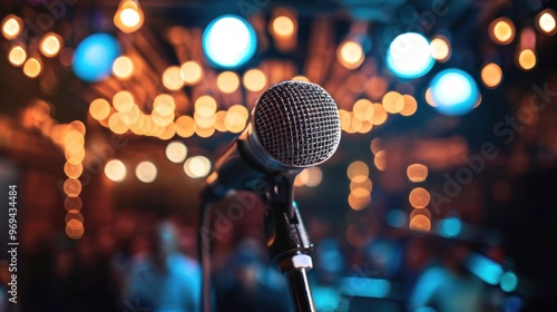 microphone, stage, music, performance, concert, sound, audio, show, live, night, club, venue, band, singer, instrument, entertainment, light, spotlight, crowd, audience, dark, background, bokeh, sharpened, blur, closeup, front, bright, dim, art, culture, singing, song, artist, vocal
