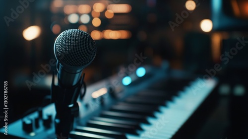 microphone, keyboard, musician, creative, light, evening, sound, instrument, performance, audio, melody, harmony, creativity, ambient, technology, equipment, artistry, rythm, vocal, setup, entertainment, mood, collaboration, professional
