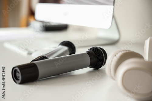 Microphones on table in recording studio, closeup