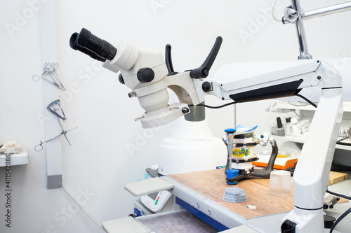 Microscope in a dental laboratory, a technician's workplace in a dental laboratory