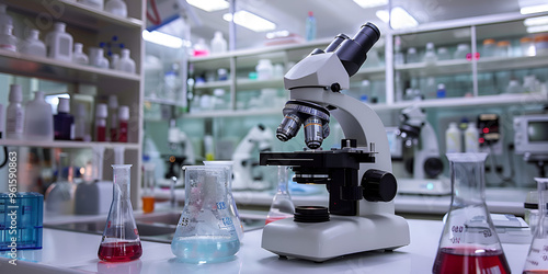 Microscope in a Modern Laboratory with Beakers, Scientific Equipment on a Workbench in a Lab