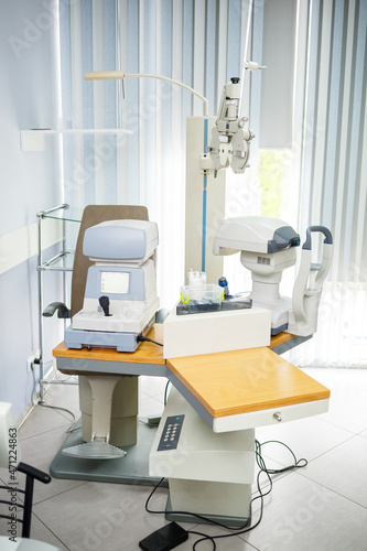 Microscopic apparatus for testing eyesight. Ophthalmology and treatment of eye diseases. Eye clinic, optometrist concept