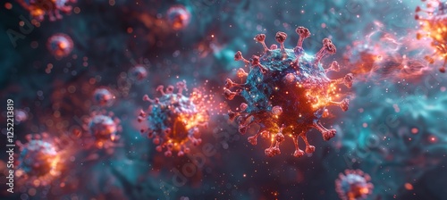 Microscopic Image Of Dangerous Virus Spread, Covid-19, Coronavirus, Symptoms, Infection. 3d Render.