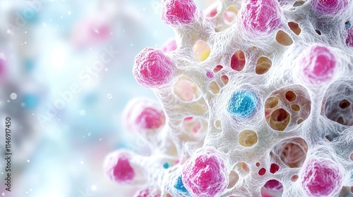 Microscopic view of a complex cellular structure with colorful nodules and porous network.