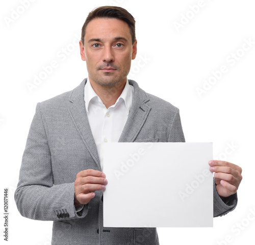banner, signs, blank, board, man, isolated, photogenic, jacket, business, businessman, billboard, shirt, white, expression, adult, middle, age, male, people, caucasian, portrait, modern, young, standing, person, isolate, background, paper, sheet, copy space, advertisement, advertising