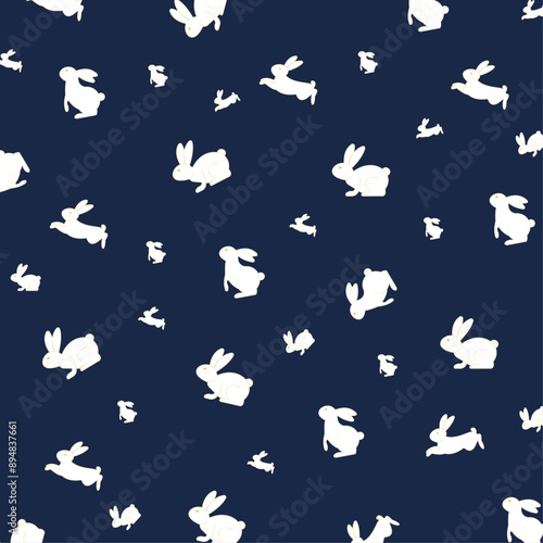 Mid Autumn festival bunny pattern poster, greeting card. Bunny pattern with gold gradient stroke on a navy blue background. Moon festival.