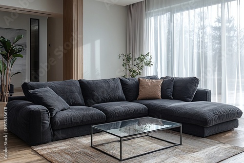 Mid century Modern interiors in the living room of a house with windows visible and sofa and cafe table. Generative AI