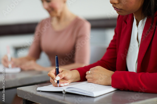 closeup, unrecognizable, hand, pen, background, planner, notebook, modern, contemporary, education, studying, learning, student, training, course, seminar, college, university, school, lesson, class, lecture, teaching, business, marketing, management, group, people, adult, mature, young, businesswoman, woman, female, mixed race, writing, taking, note, copy space, sitting, desk, table, row