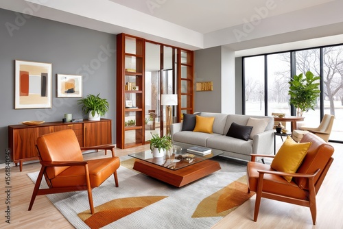 Mid-century modern living room featuring walnut furniture and bright decor elements