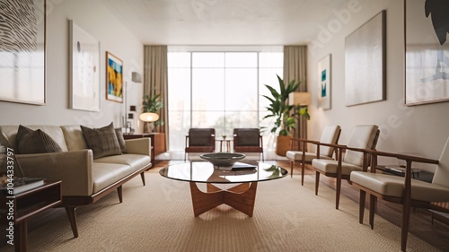 Mid-Century Modern Living Room Modern living room with large windows, comfortable furniture, and a glass coffee table.