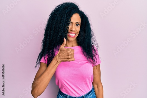 Middle age african american woman wearing casual clothes doing happy thumbs up gesture with hand. approving expression looking at the camera showing success.