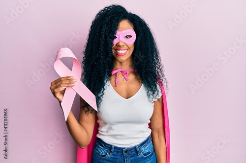 Middle age african american woman wearing super hero costume holding pink cancer ribbon looking positive and happy standing and smiling with a confident smile showing teeth
