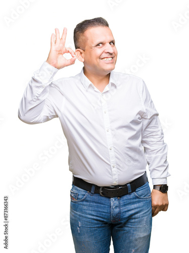 Middle age arab elegant man over isolated background smiling positive doing ok sign with hand and fingers. Successful expression.