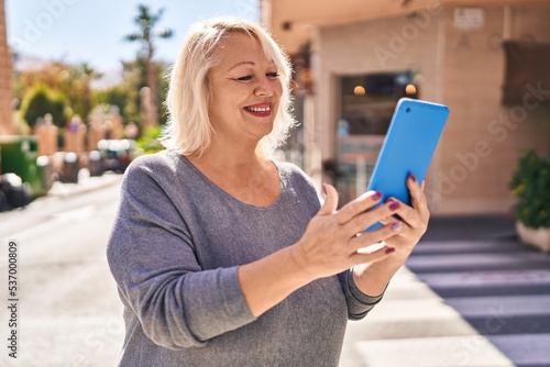 Middle age blonde woman smiling confident using touchpad at street