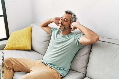 grey-haired, man, male, adult, elderly, mature, person, photogenic, senior, happy, happiness, confident, cheerful, confidence, smile, lifestyle, expression, positive, joy, smiling, enjoy, fun, funny, sitting, sofa, relax, rest, earphones, earphones, music, listening, listen, audio, sound, hearing, song, technology, contraption, device, home, house, apartment, indoor, indoor, interior, living room, room, background