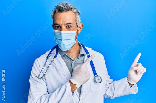 Middle age grey-haired man wearing doctor uniform and medical mask smiling and looking at the camera pointing with two hands and fingers to the side.