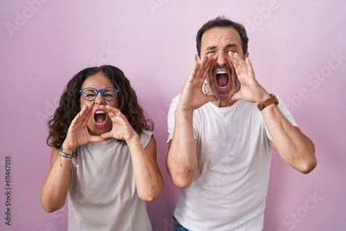 Middle age hispanic couple together over pink background shouting angry out loud with hands over mouth