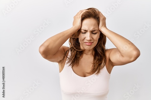 Middle age hispanic woman standing over isolated background suffering from headache desperate and stressed because pain and migraine. hands on head.
