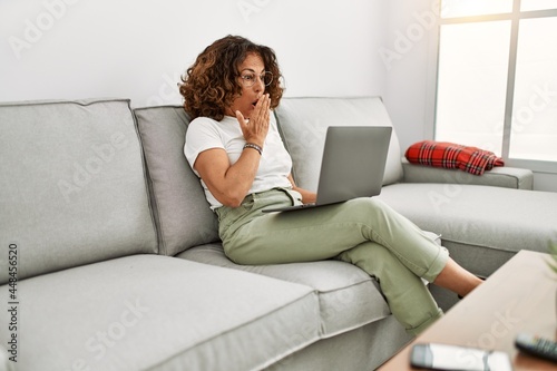 Middle age hispanic woman working using computer laptop at home covering mouth with hand, shocked and afraid for mistake. surprised expression