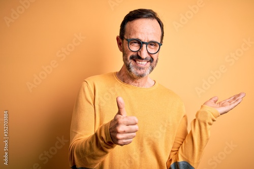 Middle age hoary man wearing casual sweater and glasses over isolated yellow background Showing palm hand and doing ok gesture with thumbs up, smiling happy and cheerful