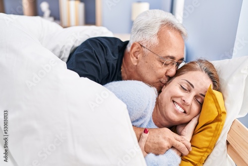 Middle age man and woman couple hugging each other and kissing lying on bed at bedroom