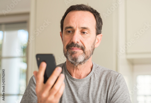 Middle age man using smartphone with a confident expression on smart face thinking serious