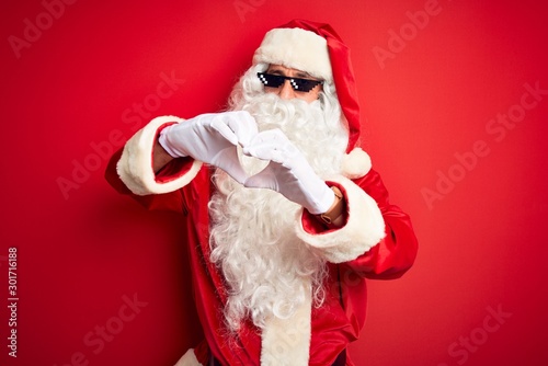 Middle age man wearing Santa Claus costume and sunglasses over isolated red background smiling in love showing heart symbol and shape with hands. Romantic concept.
