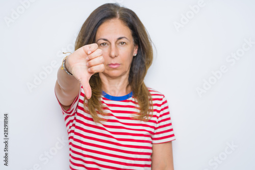 Middle age senior woman standing over white isolated background looking unhappy and angry showing rejection and negative with thumbs down gesture. Bad expression.