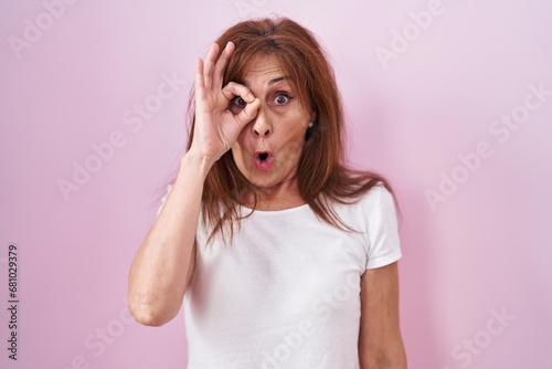 Middle age woman standing over pink background doing ok gesture shocked with surprised face, eye looking through fingers. unbelieving expression.