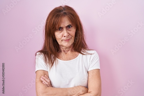 Middle age woman standing over pink background skeptic and nervous, disapproving expression on face with crossed arms. negative person.