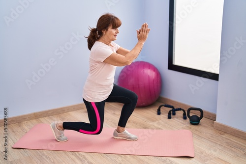 Middle age woman training legs exercise at sport center