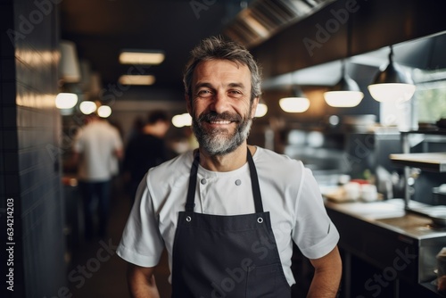 Middle aged british caucasian chef working in a restaurant kitchen smiling portrait