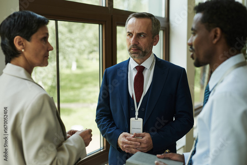 Middle aged Caucasian man standing between female and African American male colleagues, engaging in serious business conversation near large window in office setting