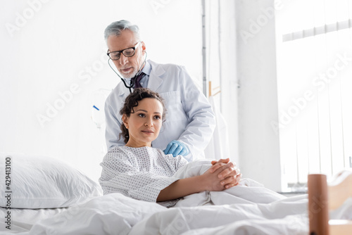 middle aged doctor in eyeglasses examining african american woman with stethoscope in clinic