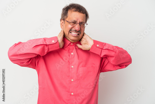 Middle aged indian man isolated on white background suffering neck pain due to sedentary lifestyle.