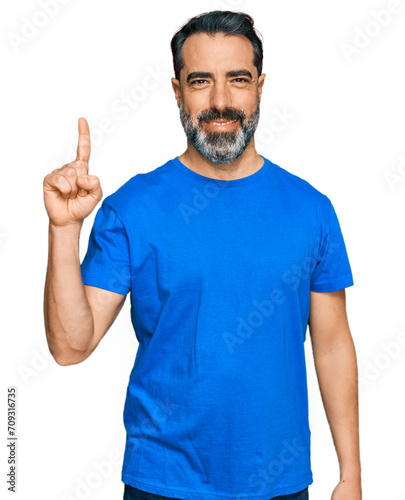 Middle aged man with beard wearing casual blue t shirt showing and pointing up with finger number one while smiling confident and happy.