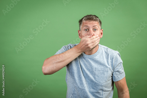 middle aged man with grey t-shirt and grey hair is posing in front of green background