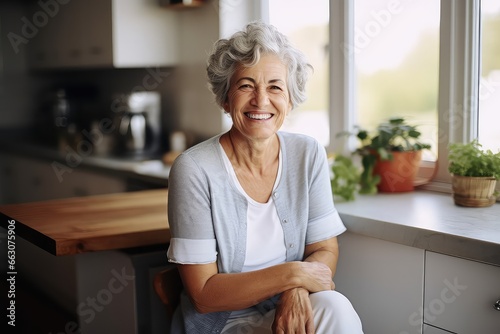 Middle Aged Woman Sitting on Sofa in Living Room at Home