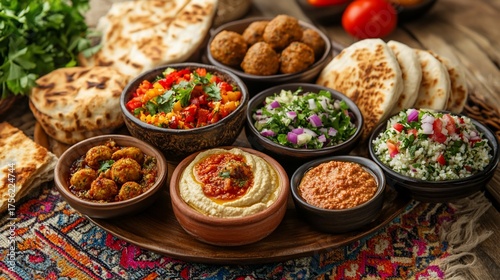 Middle Eastern dishes Hummus, salads, breads, & falafel on a patterned wooden tray