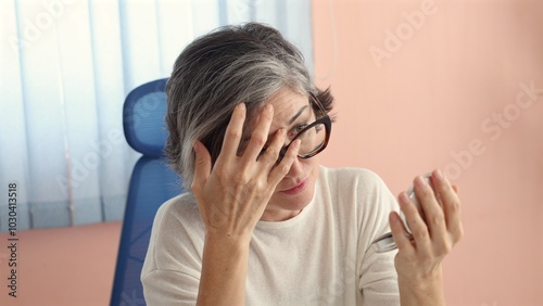 Middle-aged Caucasian woman adjusts glasses, gray hair, holding mirror, white top, blue chair, pink wall behind. Scene captures thoughtful moment during personal grooming, relaxed indoors.