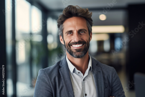 Middle-aged executive standing in a company office, with a smile on his face. Generative AI