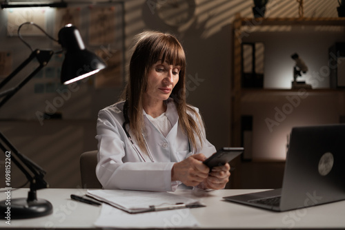 Middle-aged female doctor using smartphone in medical office working late night. nurse looking and chatting at cellphone in clinic.